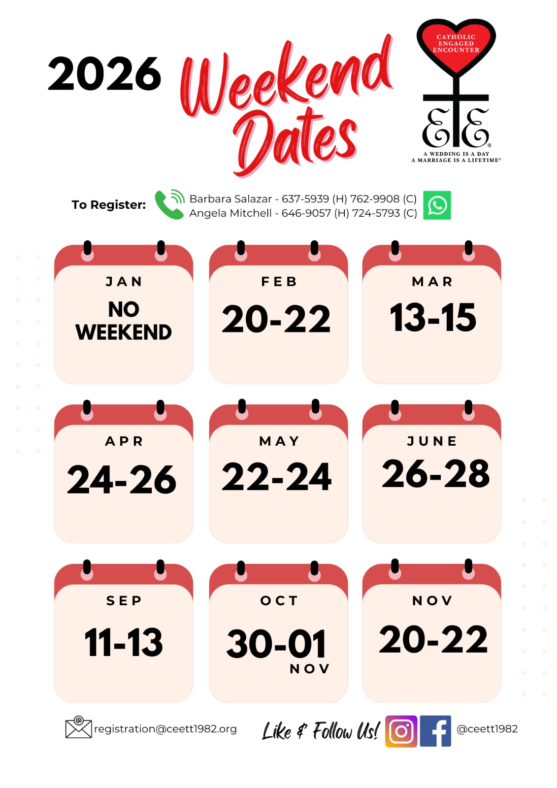 If for any reason you cannot attend the chosen weekend, please contact the registration couple immediately.